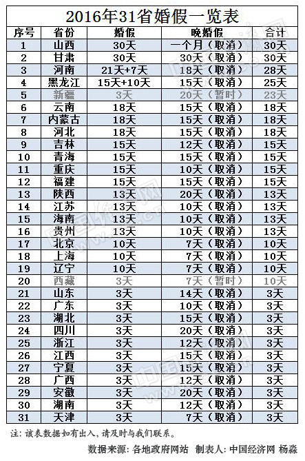 2016年31省最新婚假出炉两省30天11省仅3天